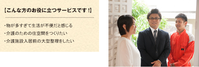 長い年月とともに増えるモノは、生活空間を圧迫し、家庭内で思わぬケガや事故の原因になります。私たちは、整理サービスを通じて「お客様が今をより良く生きること、未来の暮らしをより豊かにすること」が実現できるよう、日々取り組んでいます。