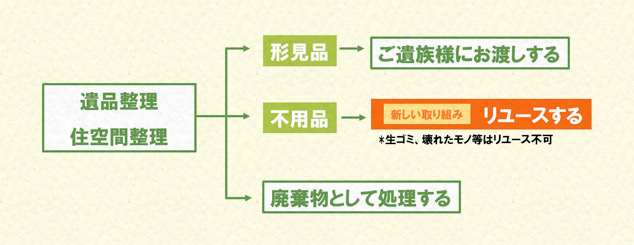 - 清閑堂では整理作業に伴って不用となった物を、リユースする取り組みを始めました。これにより、遺品の処分にかかるコストを全体の20~40%軽減することが可能です。