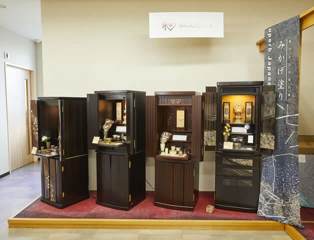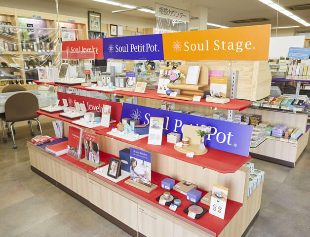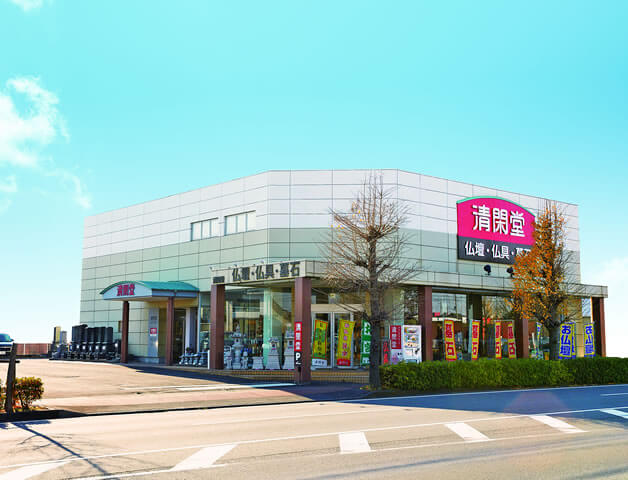 国道354号線沿い、三越跡でダイハツ様の隣、はま寿司様の向かいの店舗です。地域最大級のお仏壇の品揃えと墓石の室内展示場を完備しています。お位牌やお盆用品、最近流行りの手元供養も充実しています。ご供養のプロ、仏事コーディネーターがお客様のご要望をとことん伺います。